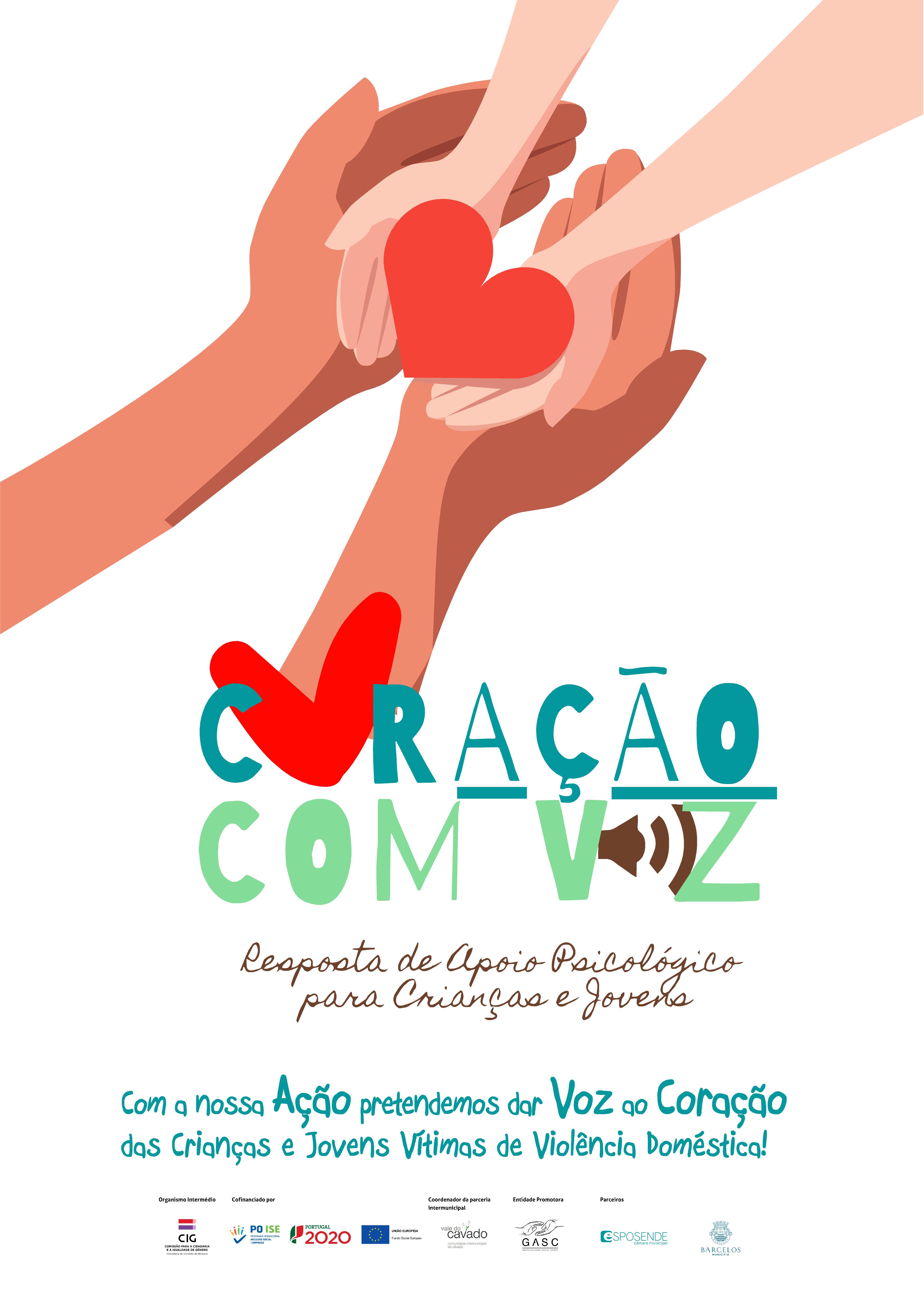 O Projeto CorAção com Voz é cofinanciado pelo POISE, Portugal 2020, no âmbito da Tipologia de Operação 3.17 – Instrumentos específicos de proteção das vítimas e de acompanhamento de agressores na violência doméstica, sendo a Comissão para a Cidadania e a Igualdade de Género (CIG) o Organismo Intermédio.